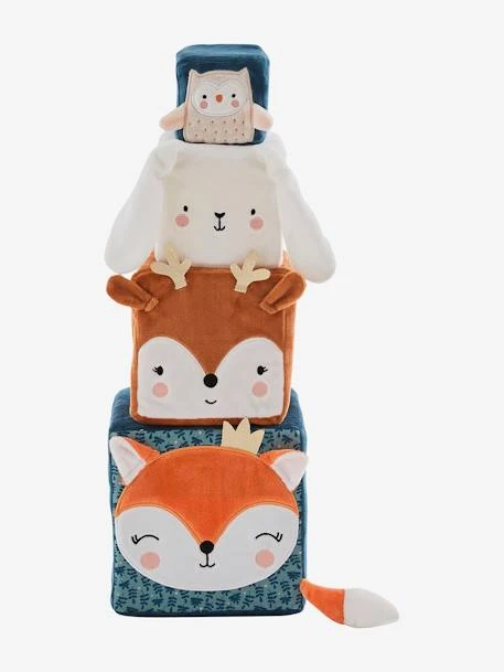 - 4 cubes de tailles différentes avec différentes textures : 1 renard : oreilles + couronne + queue en volume et visage brodé ; 1 cerf : oreilles + bois en volume et visage brodé ; 1 lapin : oreilles en volume et visage brodé ; 1 hibou : ailes en volume et visage brodé