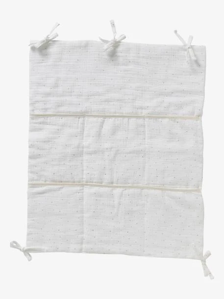 Pratique pour ranger les affaires de bébé, cet organisateur se fixe sur la table à langer ou au lit de bébé. Il dispose de 6 poches et décore avec tendresse l’espace à langer avec sa gaze de coton imprimée de petites étoiles dorées.